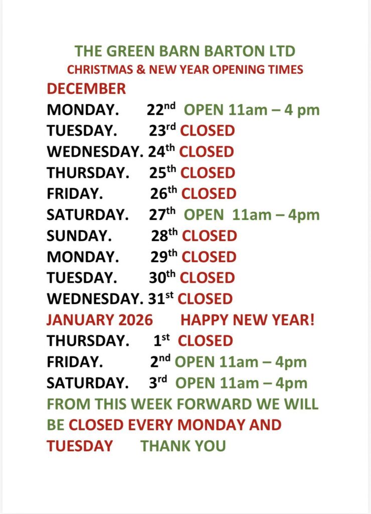 CONTACT US We love to hear feedback from our customers! Please use our email below to ask us any queries or give us a call. Our Info EMAIL TheGreenBarnEmail@gmail.com PHONE NUMBER 01223 264839 ADDRESS 16 Cambridge Rd, Barton,Cambridge, CB23 7AR OPERATINGHOURS 2026 MONDAY CLOSEDTUESDAY CLOSEDWEDNESDAY 11AM-4PMTHURSDAY 11AM-4PMFRIDAY 11AM-4PMSATURDAY 11AM-4PMSUNDAY 11AM-4PMBANK HOLIDAYS CLOSED OPERATINGHOURS 2025 You can find us here...